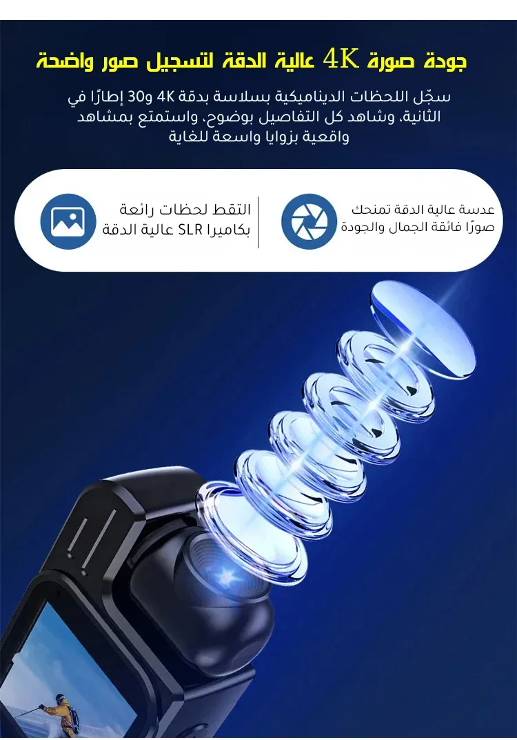 تمتاز الكاميرا بجودة تصوير 4K، تشبه كاميرات DSLR الاحترافية، مما يضمن تسجيل فيديوهات وصور دقيقة وواضحة للغاية. كل لحظة تلتقطها تصبح ذكرى حقيقية، بتفاصيل دقيقة وألوان زاهية.